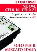 Conforme alla Delibera 119/2020/R/EEL. Test automatici/manuali su sistemi di protezione interfaccia (SPI) e protezioni generali (PG) per impianti allacciati in rete MT/BT in conformità alle norme CEI 0-16 e CEI 0-21. Erogazione corrente 15A.